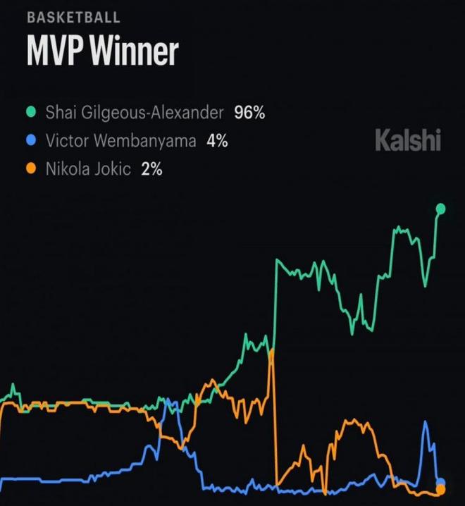 文班亚马本赛季心气很高,人气也高,首次入选全明星,而且还是MVP候选人。最新一期的MVP排行榜中,文班亚马就高居榜首,力压SGA和约基奇。不过就在今天,知名预测平台Kalshi更新了最新的MVP获奖概率,SGA高达95.5%,文班亚马只有3.5%,约基奇只有1.5%,如果Kalshi预测准确,那么SGA基本锁定MVP了。本赛季亚历山大场均31.4分4.4篮板6.5助攻1.4抢断,文班亚马场均24.8分11.5篮板3.1助攻1抢断3.1盖帽,约基奇场均28分12.9篮板10.9助攻1.4抢断。这三人大概率都会入选最佳阵容一阵。