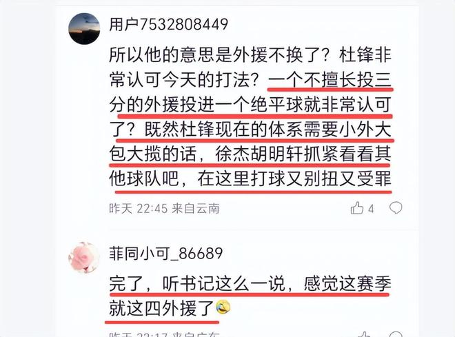 在杜锋看来,昨晚的排兵布阵是正确的,麦考尔仍然值得信赖。可是广东球迷听了杜锋新闻发布会的发言,心里凉了半截。他们说,“完了,听书记这么一说,感觉这赛季就这四外援了”、“一个不擅长投三分的外援投进一个绝平球就非常认可了?既然杜锋现在的体系需要小外大包大揽的话,徐杰胡明轩抓紧看看其他球队吧,在这里打球又别扭又受罪”。