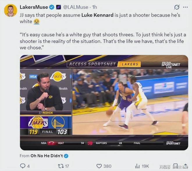 雷迪克直言:外界总因为他是白人、擅长三分,就把他简单定义成“纯投手”,这是一种误解,也是他们现在必须面对的偏见。