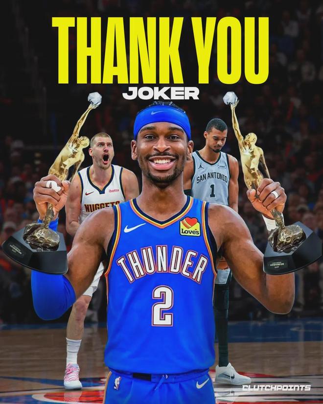 约基奇的个人数据依然是联盟最强,本赛季场均篮板、助攻、和进攻效率都是联盟第一。亚历山大场均正负值联盟第一,场均得分联盟第二,净效率联盟第四。他的优势在于球队战绩,雷霆提前锁定联盟第一,领先掘金12个胜场。