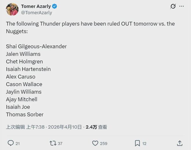 北京时间4月10日,雷霆官方更新了球队伤病报告,明天对阵掘金,雷霆有10人休战: