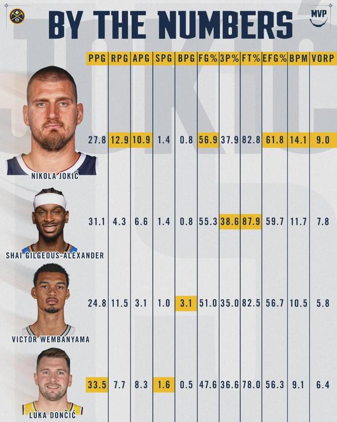 掘金官方今天晒出四个MVP候选人的数据对比,在这四个人当中,约基奇场均篮板、助攻、投篮命中率、有效命中率、基础正负值和不可替代值六项数据领先。亚历山大三分和罚球命中率领先,东契奇场均得分和抢断领先,文班场均盖帽领先。