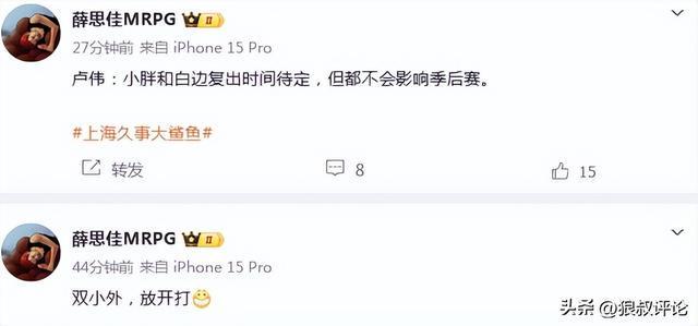 卢伟:小胖和白边复出时间待定,但都不会影响季后赛。