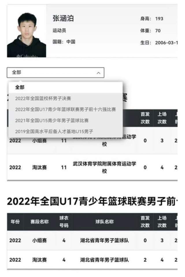 值得注意的是,张涵泊在2021-2022年仍以武汉体育学院附属体校球员身份参加U17赛事,此后再无公开比赛记录。而“武汉篮校(武体篮校)”与“武汉体育学院附属体校”实为同一机构,隶属武汉体育学院,两球员所属单位高度重合。