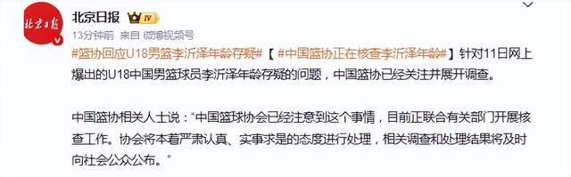 北京时间4月12日消息,中国篮球协会已就U18国青球员李沂泽年龄争议正式回应,目前正联合相关部门开展核查工作,承诺将本着严肃、实事求是的原则处理,并及时公布结果。
