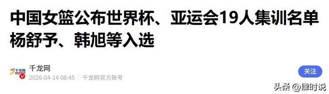 信息来源:千龙网 2026-04-14——中国女篮公布世界杯、亚运会19人集训名单 杨舒予、韩旭等入选