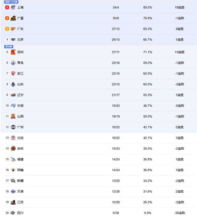 现在26胜北京暂时排在第四,27胜深圳排在第五,不过深圳因为少打一轮,所以等到深圳和新疆比赛结束,深圳赢球就能重回第三,广东则跌至第四。假设后续深圳四场比赛全部赢下,广东三场比赛全部赢下,那么最终的前四排名就是上海、广厦、深圳和广东。这四支球队可以免打附加赛,假设深圳后续四场比赛输掉其中一场,且广东三场比赛全部赢下,那么前二不变,广东第三,深圳第四。