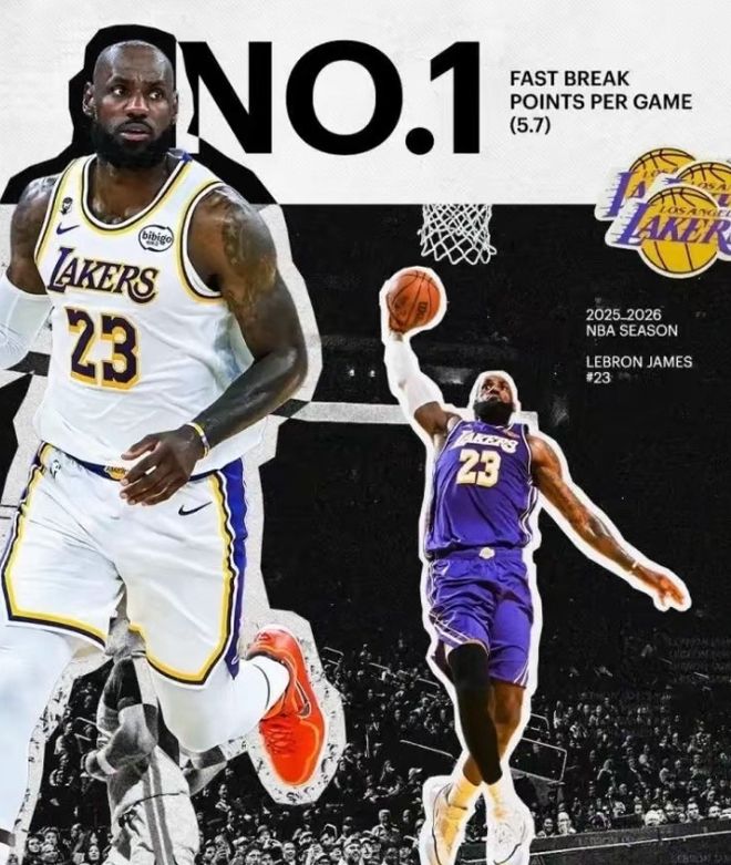 4月16日,湖人官方晒出詹姆斯的庆祝海报:23号詹姆斯又拿下联盟第一!该海报是庆祝詹姆斯本赛季场均快攻得分5.7,排名NBA第一!