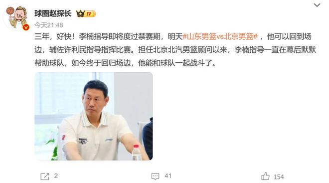 当初执教江苏肯帝亚期间,虽然李楠带队打入季后赛,但在与上海的系列赛中,因为消极比赛,他与时任上海主帅李春江都被篮协禁赛,李楠被禁赛3年,李春江则是5年。即便暂时无法出任主教练,但李楠在2024年还是以顾问身份加盟了北京男篮,且基本上一直跟队,只不过并没有正式出现在比赛场中央。