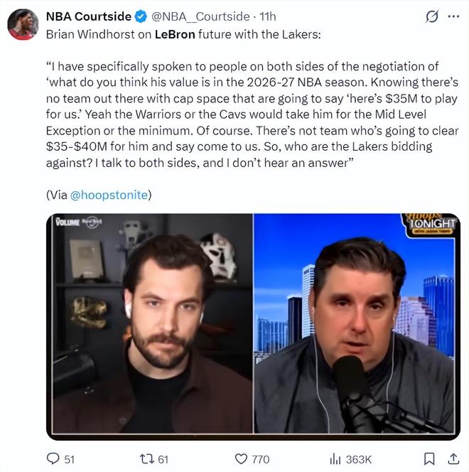 北京时间4月17日,ESPN记者布莱恩-文霍斯特在播客节目中谈到勒布朗-詹姆斯的未来,他表示我专门跟多支球队谈论过,勒布朗在26-27赛季的价值是多少?要知道没有哪支球队会给他3500万-4000万,所以湖人的竞争对手是谁?我没有听到答案,勇士队跟骑士队大概率只愿意为勒布朗提供中产/底薪合同。