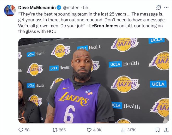 勒布朗还盛赞了37岁的杜兰特,他表示:KD是火箭的核心,但火箭队还有很多出色的球员,所以现在的火箭不是杜兰特去领导,KD会按照他一贯的方式去打球,我们都很清楚这一点,我们必须为这场比赛做好周详的准备。