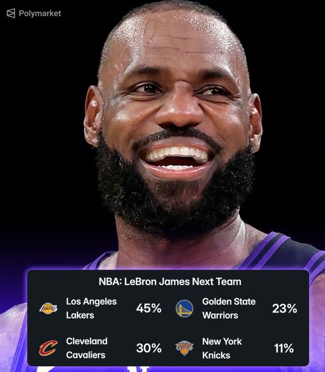 根据数据媒体的预测,勒布朗留守湖人概率45%,加盟勇士概率23%,加盟骑士概率30%,加盟尼克斯概率11%。