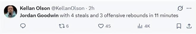 开场短短11分钟,古德温就贡献了3个前场篮板4个抢断,让太阳队记Kellan Olson赞誉有加。