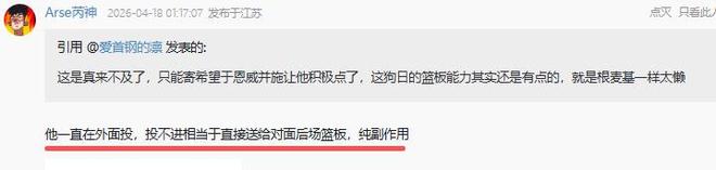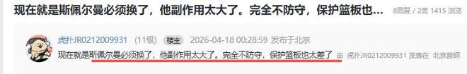 问题外援斯佩尔曼也彻底激怒北京球迷,他们说“斯佩尔曼必须换了,他副作用太大了。完全不防守,保护篮板也太差了”、“他一直在外面投,投不进相当于直接送给对面后场篮板,纯副作用”。这样的外援该留着吗?各位看官,你对斯佩尔曼有何评论?