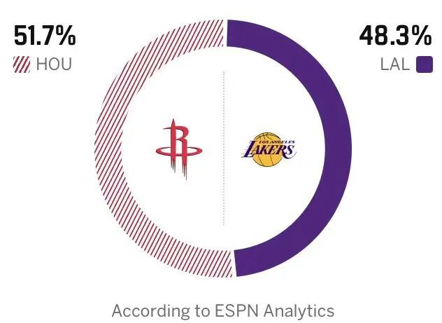 知名美媒ESPN预测G1火箭胜率51.7%,湖人则是48.3%。