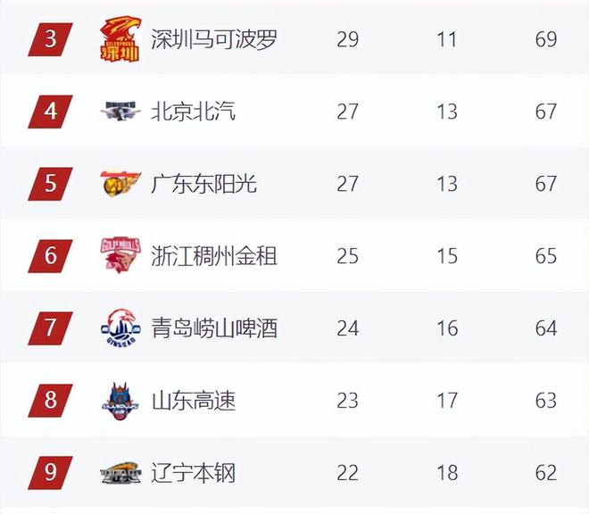 第6-9名球队排名和上一轮相比保持不变,浙江65分领先青岛、山东继续稳居第6,青岛、山东分列第7、第8,山东63分领先辽宁1分,辽宁仍是第9,辽宁还有机会冲击前八,但主动权已经不在他们这边了(除非最后2场山东全败,辽宁全胜)。