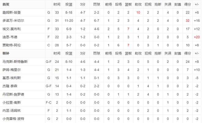 这场比赛骑士全队五人得分上双其中还有三人20+,替补席的斯特鲁斯24分钟10中8+三分6中4拿到24分成为奇兵,米切尔20投拿到32分,哈登则还是将全队串联起来他又送出了20+10的数据。