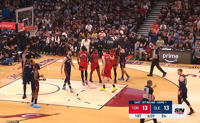 比赛开局就火药味拉满,两队迅速进入高强度缠斗模式。猛龙延续常规赛的打法,依靠锋线冲击力发起猛攻,巴雷特、巴恩斯接连冲击内线得分,试图继续压制骑士。