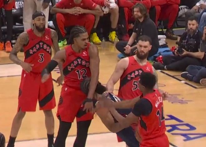 这可没完,就在哈登被三人夹击倒地时,博伊尔斯还有一个刻意屈膝发力的动作,左膝盖顶了哈登后脑勺一下,哈登非常痛苦,裁判就在3米左右的位置,依旧没有任何吹罚表示!实话实说,这确实有点过分了,因为猛龙球员看到哈登,下手确实非常狠。