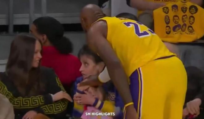 值得一提的是,在比赛过程中,前排的小女孩不慎被篮球砸到,詹姆斯上前去安慰小女孩,无疑是极为暖心一幕。