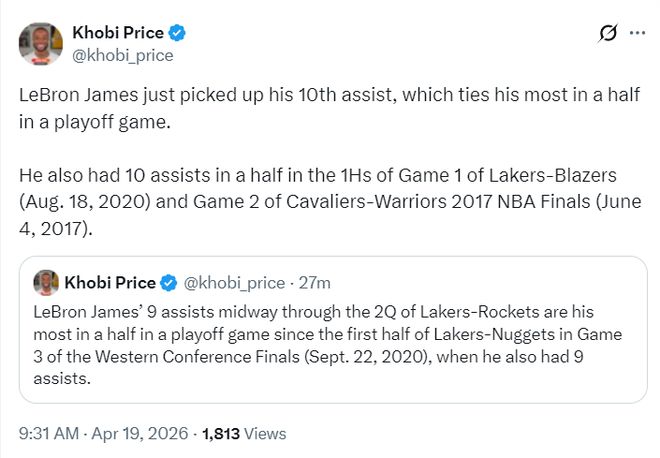 北京时间4月19日,NBA季后赛首轮G1,湖人以107-98击败火箭。这场比赛41岁的勒布朗生涯第293次出战季后赛,他首节就送出8次助攻,半场送出10次助攻,勒布朗努力的态度感染了全队,最终41岁的他拿到19+13+8带队取胜。