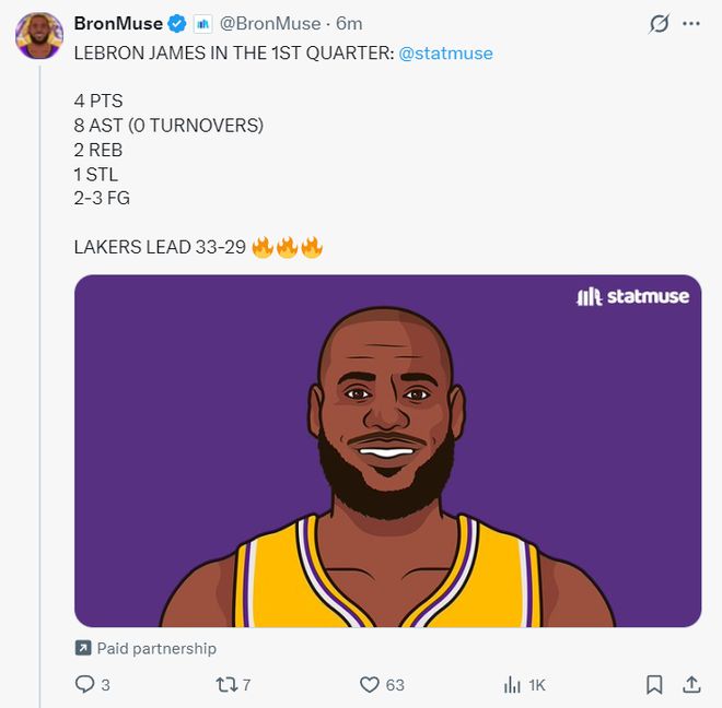 湖人缺少了里夫斯与东契奇两位持球大核,雷迪克表面上是让肯纳德担任一号位,实际上还是让勒布朗发挥组织前锋的才能,他在9分钟的登场时间里拿到4分2篮板8助攻1抢断,詹姆斯单节8助攻造生涯新高。