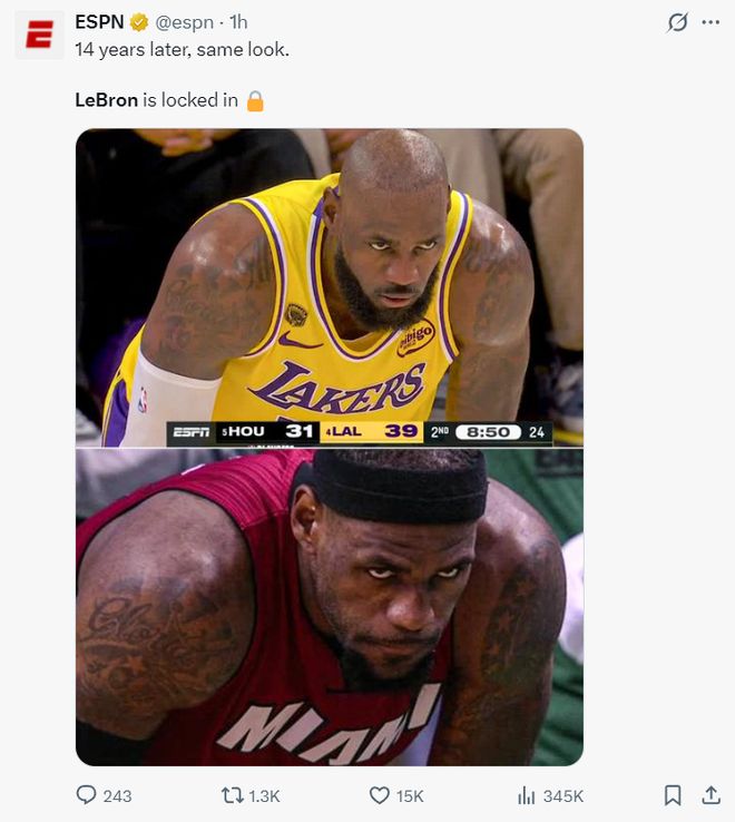 末节开场湖人已经领先到13分,詹姆斯的死亡之瞳感染了全队,詹姆斯外线三分命中,詹姆斯左手随手一抛继续命中,詹姆斯后仰跳投命中后比赛已经走向完结。