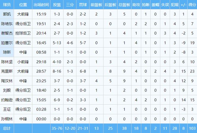 陶汉林无愧“队魂”称号。在前期的5连败中,他堪称全队唯一保持强势的一员,而在对阵深圳的这场比赛中,他持续积极、强硬的发挥,贡献9分9篮板,其中有4个前场篮板。评分9.6分。