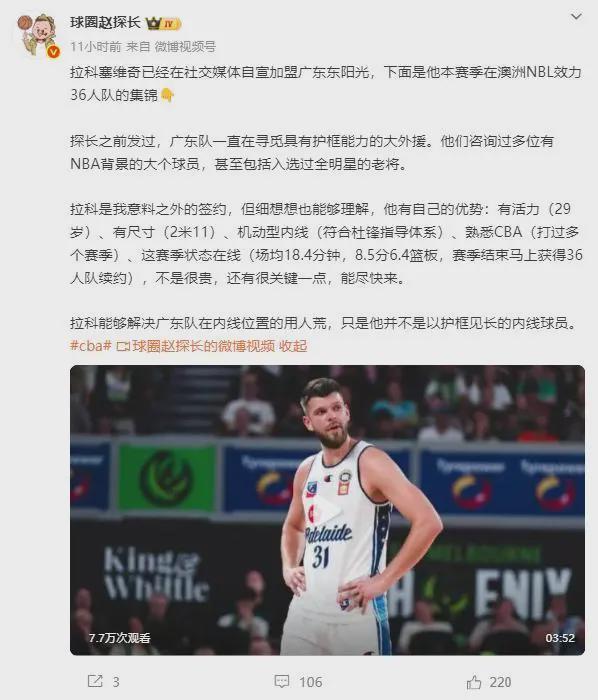 眼看常规赛就要结束了,在找不到合适外援的情况下,朱芳雨最终选择了拉科塞维奇,我觉得这是当下最好的选择了!拉科塞维奇才打完澳大利亚NBL联赛,个人竞技状态没问题,还在澳大利亚联赛场均出战18.4分钟,得到8.5分6.4篮板。再者,拉科塞维奇对于CBA足够了解,这一点很重要,如果来的大外援个人能力很强,但他适应不了CBA,那还不如拉科塞维奇。此外,拉科塞维奇的价格很便宜。其实在CBA,外援的表现往往取决于球队体系,有些外援在其他球队不行,换了一支球队就成为了超级外援。广东就剩下2场常规赛了,教练组要想办法让拉科塞维奇融入到球队当中。