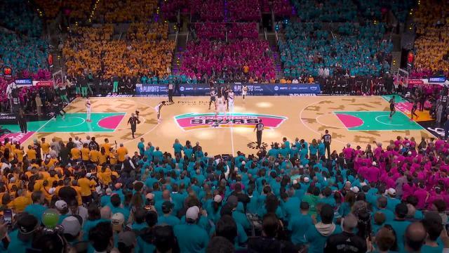 这是马刺时隔7年再进季后赛,球队为现场球迷提供了不同颜色的加油T恤。兴奋的球迷们套上T恤后,马刺主场呈现出不同色块组成的方阵,呼应着今晚马刺球场的配色,气势如虹。
