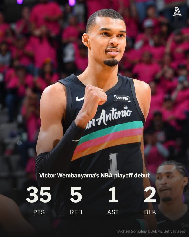 这是马刺时隔7年首次重返季后赛,也是文班亚马的季后赛初体验,你在他身上看到的并不是紧张,而是兴奋。全场比赛,马刺巨星轰下35分5篮板2盖帽,打破了由邓肯保持的马刺队史季后赛首秀得分纪录,带领球队111比98大胜开拓者,赢得开门红。他的35分里包含了5记三分球,这也让文班亚马成为了历史首位季后赛首秀拿到35分,且投中至少5记三分的球员。
