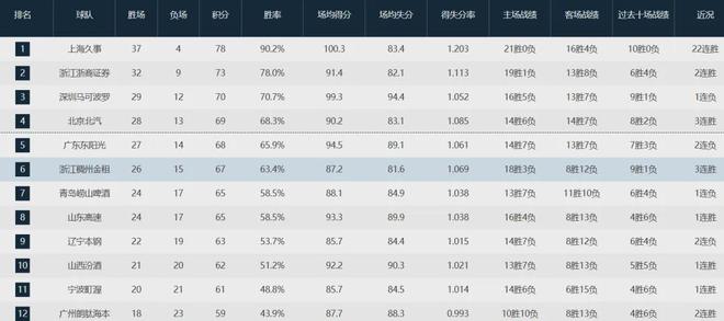 上海队当前战绩为37胜4负高居联盟第一,排在后面的是卫冕冠军广厦队(32-9)、深圳队(29-12)、北京队(28-13)、广东队(27-14)、浙江队(26-15)、青岛队(24-17)、山东队(24-17)、辽宁队(22-19)、山西队(21-20)、宁波队(20-21)和广州队(18-23)。