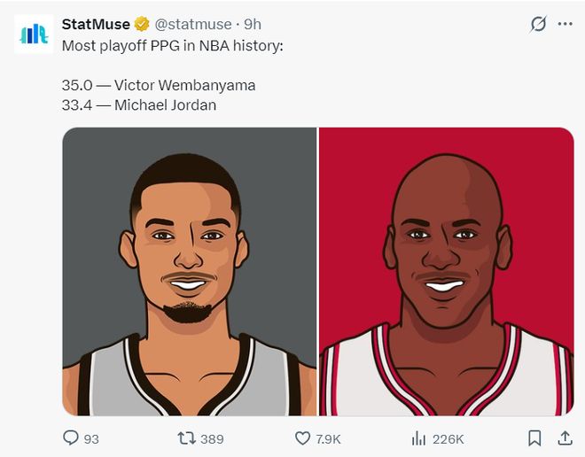 因为22岁的文班亚马首场季后赛就如此爆炸,数据媒体StatMuse用乔丹调侃他,数媒写道:文班亚马首秀35分,乔丹季后赛场均33.4分不及文班。