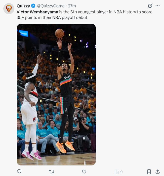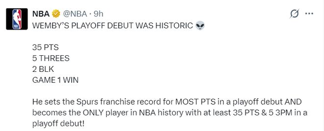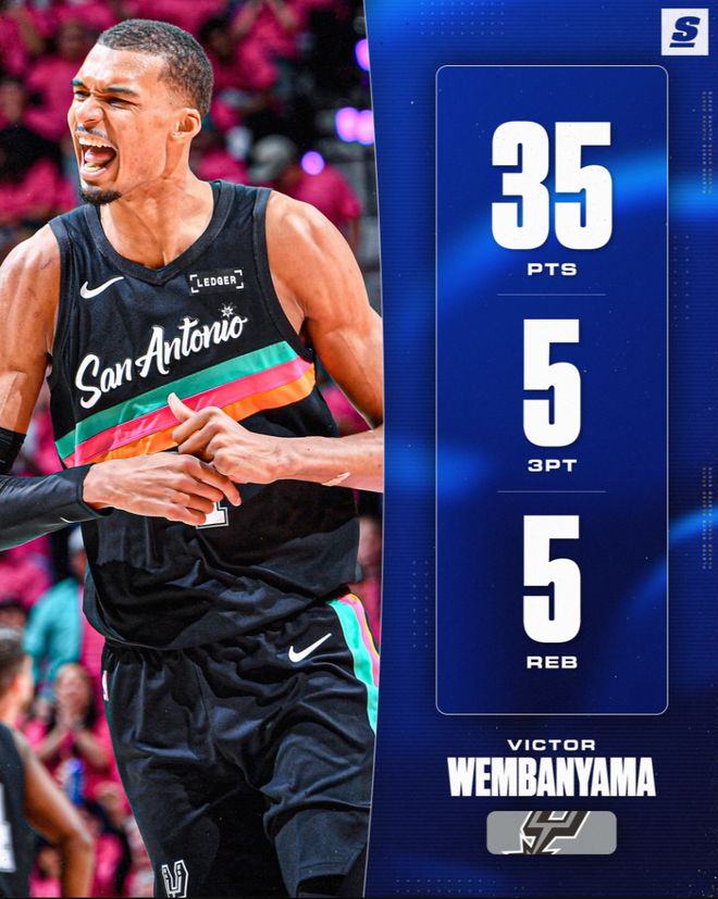 1.文班亚马首秀35分超越邓肯的32分,成为马刺季后赛首秀得分王;
