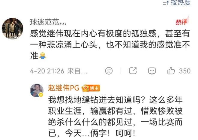 在大比分输掉比赛之后,赵继伟在自己的社交媒体上面发了“呵呵”两个字,并且在评论区回复道“这么多年大胜惨败绝杀都见过了,但是对于今天这场球,只有呵呵两个字”,并且在现场可以看到赵继伟显得非常的落寞,球队目前的凝聚力真的太差了,目前这样的情况下去,辽宁男篮季后赛估计真的一轮游的情况了!