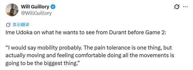 乌度卡谈及杜兰特在G2前需要达到的状态:“我觉得关键还是移动能力。疼痛耐受度是一方面,但能否顺畅跑动、完成所有动作且体感无不适,才是最重要的。”