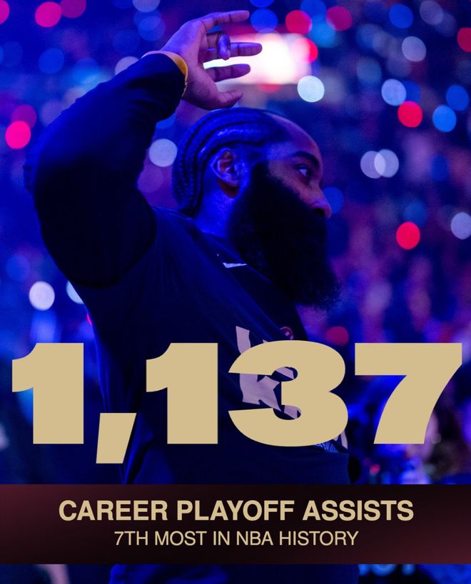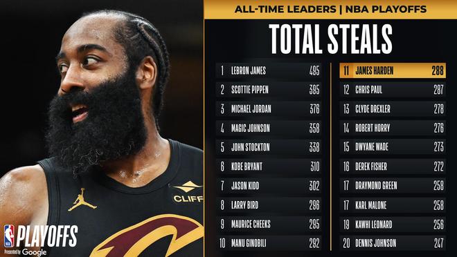 这场比赛还是哈登的里程碑夜晚,哈登季后赛助攻数来到1139次超越隆多升至历史第七位;哈登本场比赛送出5个抢断,他超越保罗升至历史季后赛抢断榜单第11位。