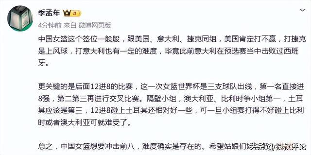 中国女篮这个签位一般般,跟美国、意大利、捷克同组,美国肯定打不赢,打捷克是上风球,打意大利也有一定的难度,毕竟此前意大利在预选赛当中击败过西班牙。