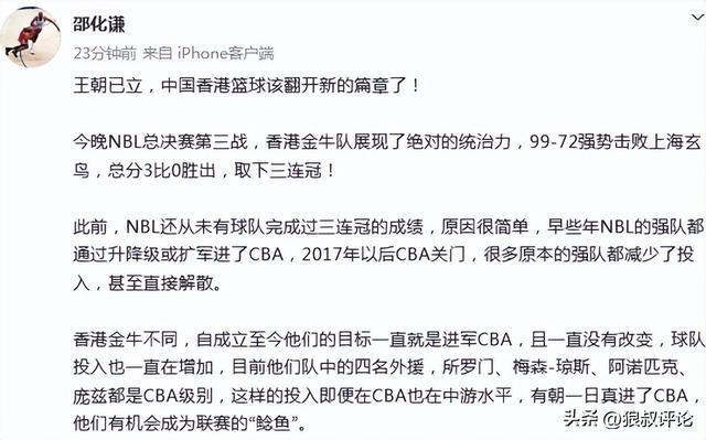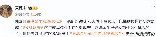恭喜香港金牛篮球俱乐部 ,他们以99比72大胜上海玄鸟,以摧枯拉朽的姿态完成了#NBL联赛# 的三连冠伟业!在NBL联赛,香港金牛已经没有什么可挑战的了,他们应该出现在CBA联赛!