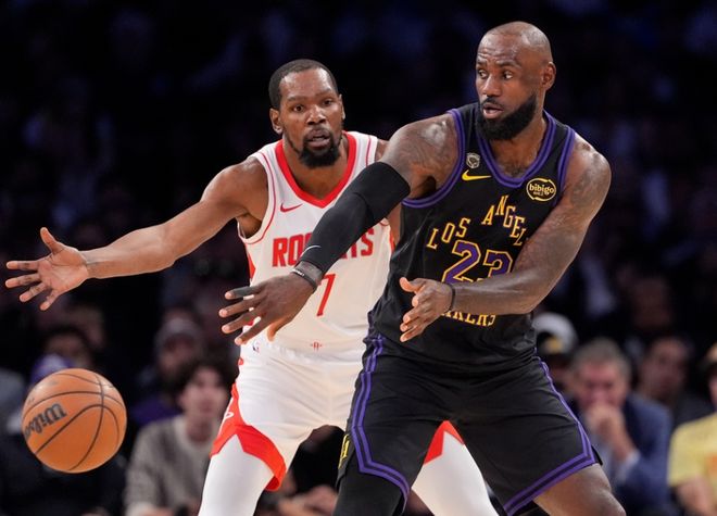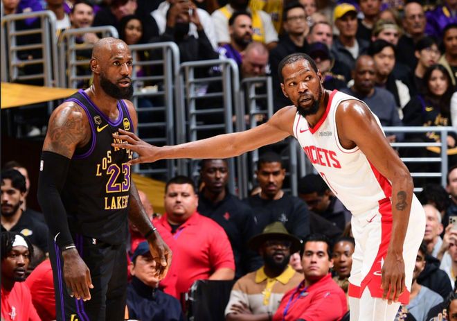 北京时间4月22日,NBA季后赛首轮G2湖人主场对阵火箭,37岁的杜兰特迎来复出,他与41岁的詹姆斯上演“詹杜对决”。杜兰特前4中4高效得到11分,但詹姆斯后来居上一度攻传结合引领15-0攻势,并且率领湖人在次节逐步拉开15分领先优势。只是火箭一波14-0攻势迫近比分,湖人接连得分略微巩固优势,上半场结束湖人54-51领先火箭。前两节比赛,詹姆斯14+6+2、斯马特17分与肯纳德12分,杜兰特20分与小贾10分。