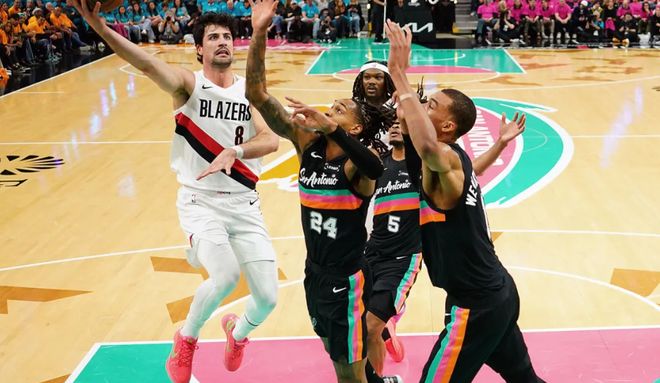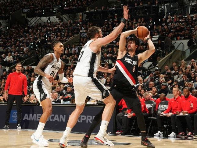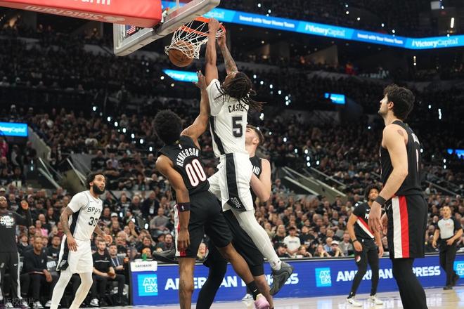 两队数据:开拓者,亨德森31分1板、霍勒迪16分5板9助2帽、阿夫迪亚14分4板3助、威廉姆斯11分9板3助、卡马拉10分8板1助2断、克林根9分11板1助2帽、夏普9分1板、格兰特5分1板、穆雷1分2板、塞布尔1板1助;马刺,卡斯尔18分8板5助、福克斯17分2板4助3断、瓦塞尔16分12板2助3断、科内特10分9板2助2断、哈珀10分2助、尚帕尼9分3板2帽、凯尔登7分4板1助2断、布莱恩特7分2板2助、文班亚马5分4板1助、巴恩斯4分1板。