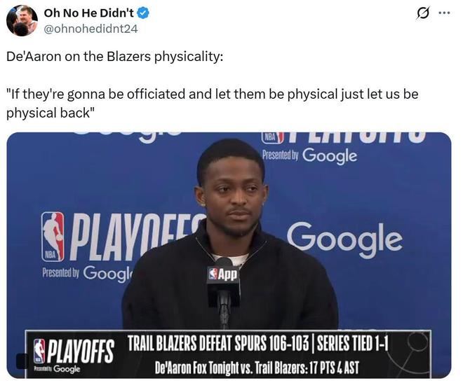 赛后福克斯公开对吹罚表达不满:“如果裁判默许他们这么强硬对抗,那也得允许我们强硬回击。”