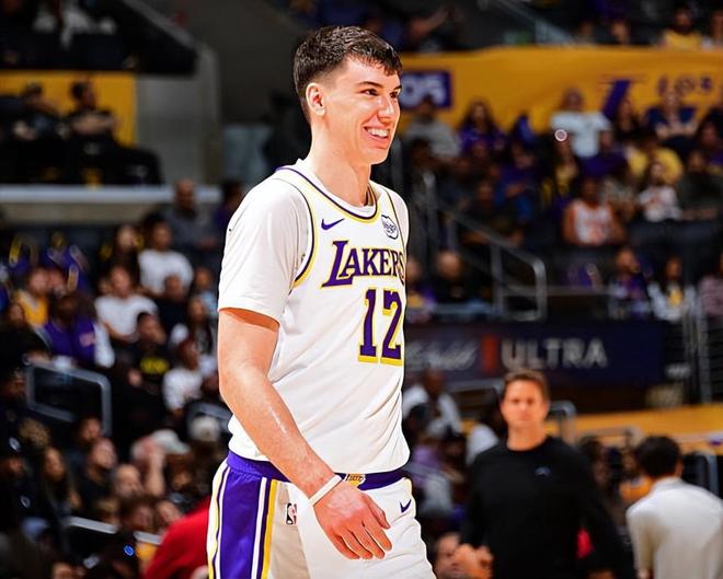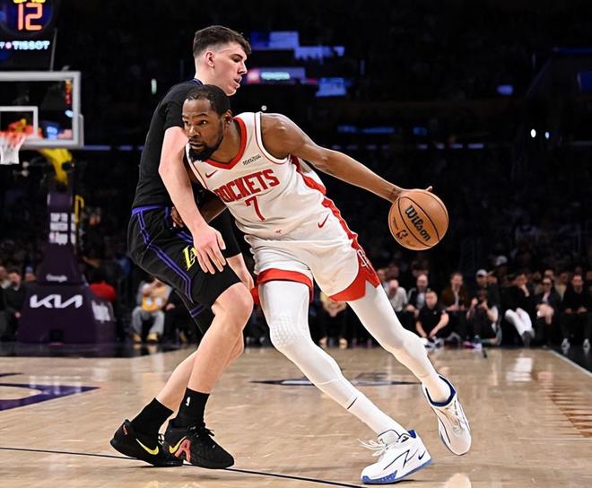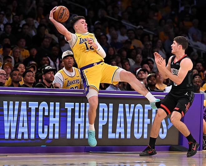 本场比赛中,湖人的替补侧翼新星杰克-拉拉维亚(Jake LaRavia)也是非常卖力的。拉拉维亚全场出场15分50秒,投篮2中0,三分线外1中0,全场1分未得,贡献了2篮板1盖帽的数据,还有2次失误和5次犯规,正负值为+8。拉拉维亚在本赛季的整体表现还是相当不错的,他也是展现出了自己在防守端的活力和积极性,他的努力也是收到了一定的效果。至少他在场上时,火箭的进攻也是陷入了停滞的状态。拉拉维亚在进攻端的存在感确实是非常有限,他的得分能力、投射能力以及组织和串联能力都非常一般,他还是很难在这种情况下展现出自己的价值。不过他在场上时球队的整体局面也确实是相当不错的水平,他也确实是成功起到了作用,帮助球队顺利度过了比赛衔接阶段这一段时间。