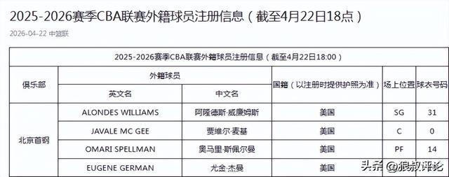 北京时间4月22日,根据CBA官方的公示,北京男篮正式裁掉了小外援贝利,注册新外援阿隆德斯·威廉姆斯。