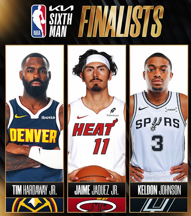 NBA季后赛正在如火如荼地进行当中,常规赛各大奖项也在陆续揭晓。在此之前,马刺队的文班亚马全票当选DPOY,雷霆队的SGA以484分的高分当选年度最佳关键球员。按照NBA联盟官方的安排,第3个要揭晓的个人奖项是年度最佳第六人。根据此前的报道,马刺队的凯尔登约翰逊、掘金队的小哈达威和热火队的哈克斯是该奖项的三大终极候选人。就在刚刚,NBA官方准时公布了年度最佳第六人!