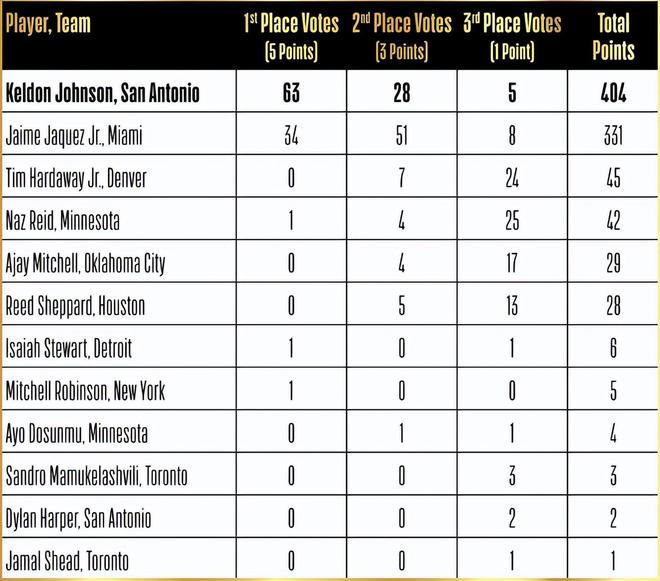 来自NBA官方的消息,马刺队锋卫摇摆人凯尔登约翰逊荣获2025-26赛季年度最佳第六人!随后,NBA官方发布了三位最佳关键球员得分情况,具体如下:凯尔登约翰逊斩获了63张第一选票,28张第二选票和5张第三选票,总得分高达404分;哈克斯拿到34张第一选票,51张第二选票和8张第二选票,总得分为331分;小哈达威拿到7张第一选票和24张第三选票,总得分仅为45分。值得一提的是,森林狼队的里德(42分)、雷霆队的米切尔(29分)、火箭队的谢泼德(28分)、活塞队的斯图尔特(6分)、尼克斯队的米罗(5分)、森林狼队的道苏姆(4分)、猛龙队的马穆(3分)、马刺队的哈珀(2分)和猛龙队的谢德(1分)分享了剩余选票。