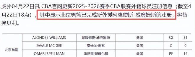 4月22日,北京首钢俱乐部官网发布公告:新援阿隆德斯·威廉姆斯已完成全部注册材料审核及联盟备案,即日起具备参赛资格;与此同时,贝利的名字已从官方注册名单中移除,双方合作关系正式终止。