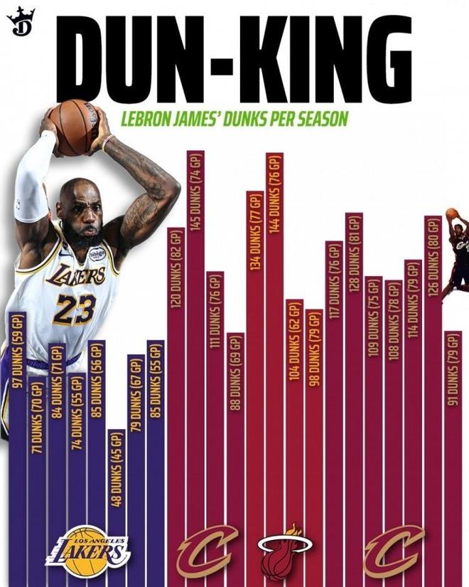美媒Crazy Stats点评表示:“享受这神级表演吧,你很难想象,跨越22年光阴,41岁的詹姆斯,单季扣篮数超越19岁初入联盟的自己。出场更少、年龄更大,空中统治力不降反升,这不是单纯的状态维持,是违背年龄规律的竞技奇迹。”
