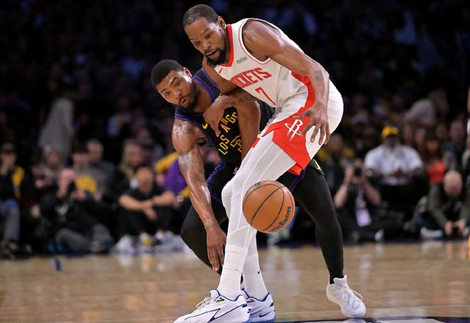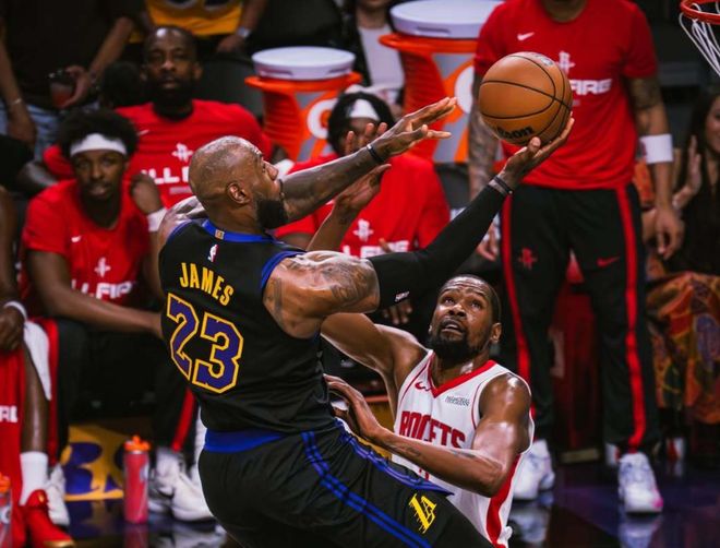 杜兰特不持球,发挥不了他的威力;他只要持球,失误不断,把全队节奏都打乱了。数据不说谎,火箭季后赛场均96分倒数第二,三分球命中率29%倒数第一,两分球命中率39%倒数第二,场均只进9.0记三分球,联盟垫底,这个进攻效率,根本威胁不到湖人。关键是在东契奇和里夫斯养伤期间,湖人季后赛的增量太多了!詹姆斯场均23.5分8篮板10助攻,肯纳德场均25分5篮板2.5助攻,三分球命中率72.7%;斯玛特场均20分7.5助攻3抢断,三分球命中率50%;包括艾顿,都在申京这里找到自信,场均12.5分8篮板。