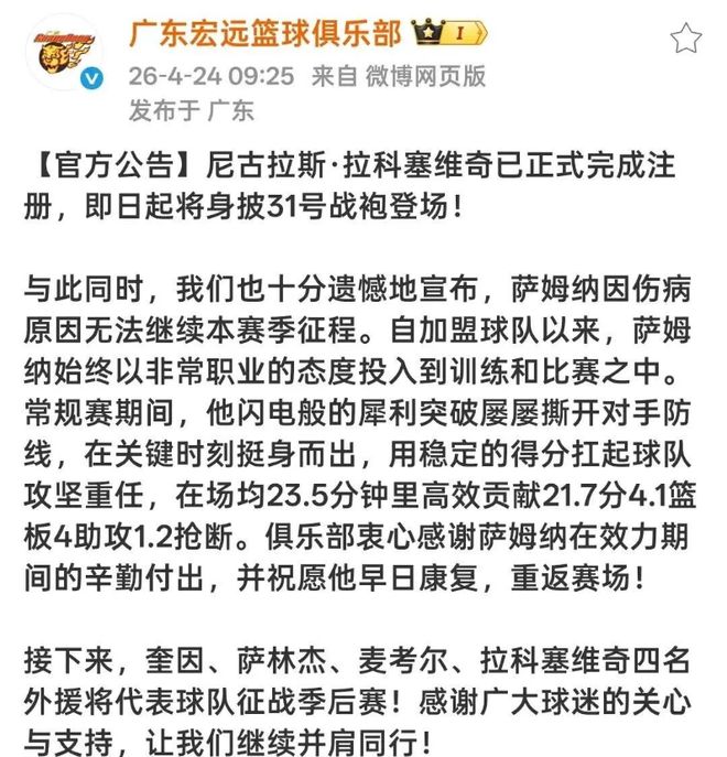 首先我们来看广东男篮,目前拉科塞维奇已经跟随球队前往了厦门征战最后一场对战福建男篮的比赛,今天早上广东男篮也是紧急为拉科塞维奇进行了注册,并且发出了声明,萨姆纳由于伤病的影响,无法出战这个赛季之后的比赛,所以拉科塞维奇是顶替了萨姆纳的位置,广东男篮这个赛季最后时刻将会以萨林杰、麦考尔、奎因以及拉科塞维奇来征战这个赛季的季后赛,其实萨姆纳的不打让广东男篮缺少了比较大的得分支援,好在目前麦考尔和奎因搭档之下的状态感觉也非常不错,所以也是让广东男篮大胆的做出了最后的抉择,也是希望萨姆纳可以早日康复!